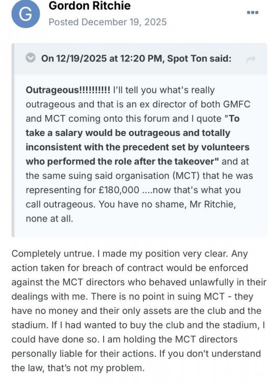 BishopBrennan Posted December 12, 2025 Posted December 12, 2025 12 hours ago, Roger McQueen said: I do have huge concerns over who MCT will appoint and it appears that whoever comes in won't be provided with an assistant as Stand Sitter Davies will be part of taking the job. MCT won't have any input into the appointment, that is solely the responsibility of the GMFC board. You address me by my proper title, you little bollocks!